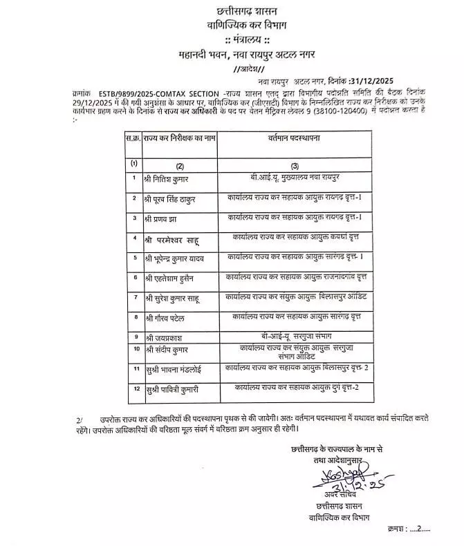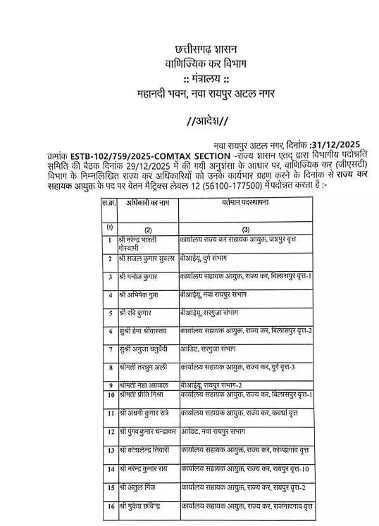 रायपुर : राज्य सरकार ने GST विभाग में राज्य कर अधिकारियों और निरीक्षकों की पदोन्नति सूची जारी कर दी है। जारी सूची में कुल 28 अधिकारियों के नाम शामिल किए गए हैं। विभाग द्वारा स्पष्ट किया गया है कि पदोन्नत राज्य कर अधिकारियों की नई पदस्थापना अलग से आदेश जारी होने के बाद की जाएगी।