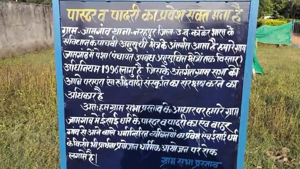 गांव की सीमाओं पर दो विपरीत बोर्ड नजर आते हैं, जो आस्था और विरोध के प्रतीक बन चुके हैं। एक बोर्ड पर लिखा है: “यह पांचवीं अनुसूची क्षेत्र है, पास्टर, पादरी और धर्मांतरित व्यक्तियों का प्रवेश वर्जित है।” वहीं, पास ही “डायोसिस ऑफ चर्च ऑफ गॉड” का बोर्ड लगा है। ग्रामीणों का कहना है कि ये बोर्ड पेसा एक्ट 1996 की धारा 4(घ) के तहत ग्राम सभा के अधिकारों पर आधारित हैं, जो सांस्कृतिक संरक्षण की अनुमति देते हैं।