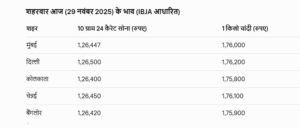 पिछले हफ्ते सोने और चांदी की कीमतों में जबरदस्त तेजी देखने को मिली। इंडियन बुलियन एंड ज्वैलर्स एसोसिएशन (IBJA) के आंकड़ों के अनुसार, 21 नवंबर 2025 को 10 ग्राम 24 कैरेट सोने की कीमत 1,23,146 रुपए थी, जो 28 नवंबर तक 3,445 रुपए बढ़कर 1,26,591 रुपए पर पहुंच गई। आज 29 नवंबर को यह कीमत 1,26,447 रुपए प्रति 10 ग्राम पर स्थिर रही। सोने का अब तक का उच्चतम स्तर 17 अक्टूबर 2025 को 1,30,874 रुपए प्रति 10 ग्राम था।