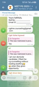 इस बीच, स्वास्थ्य क्षेत्र में एक और विवाद NEET PG 2025 काउंसलिंग को लेकर गरमा रहा है। सोशल मीडिया पर वायरल हो रही टेलीग्राम चैट्स और मेरिट लिस्ट की स्क्रीनशॉट्स से पता चलता है कि गैर-डोमिसाइल (छत्तीसगढ़ के बाहर के) उम्मीदवार राज्य कोटा सीटें हथिया रहे हैं। एक वायरल चैट में ‘डॉ. टेंगेराइन’ नामक यूजर कहते हैं, “I am non domicile candidate, I filled the cg counselling without reading anything when they given opportunity.” अन्य यूजर्स ने भी पुष्टि की कि प्रॉस्पेक्टस में इसकी अनुमति दी गई है।