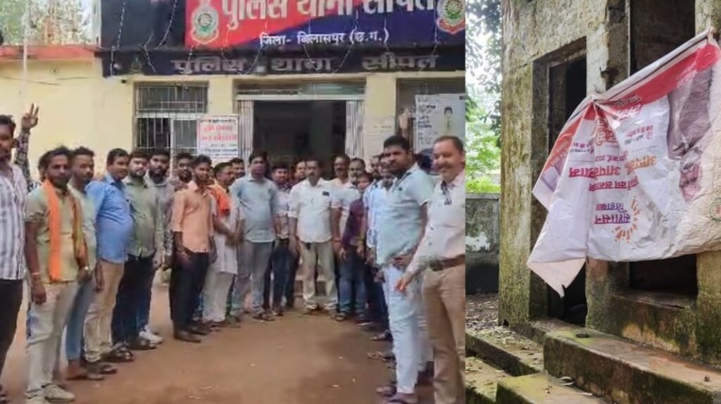 छत्तीसगढ़ की न्यायधानी बिलासपुर का सीपत थाना विवादों के घेरे में आ गया है। थाना परिसर में स्थित सार्वजनिक शौचालय का दरवाजा टूटने के बाद उसे ‘सुशासन तिहार’ के पोस्टर से ढक दिया गया, जिसमें प्रधानमंत्री नरेंद्र मोदी और मुख्यमंत्री विष्णुदेव साय की तस्वीरें हैं। इस घटना की जानकारी मिलते ही भाजपा कार्यकर्ता मौके पर पहुंचे और कड़ा विरोध जताया। उन्होंने दोषियों पर कार्रवाई और थाना प्रभारी को हटाने की मांग की।